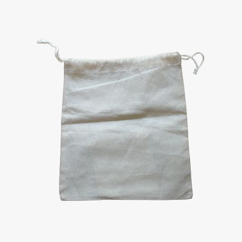 Kisméretű, zsinóros vászonzsák natúr színben.